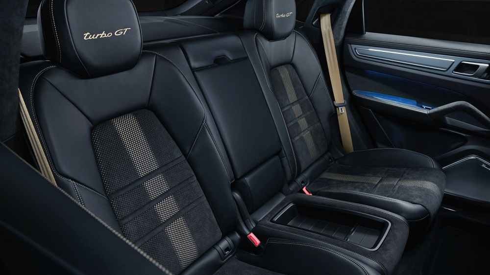 В салоне спортивный характер Cayenne Turbo GT подчеркивает высококачественное серийное оснащение с расширенной отделкой из алькантары. Спортивные передние сиденья с восьмипозиционной регулировкой и спортивные задние сиденья (с двумя посадочными местами) входят в базовую комплектацию. Как обычно для моделей GT, сиденья на центральной части обиты перфорированной алькантарой, украшены контрастными акцентами цвета Neodyme или Arctic Grey и надписями «turbo GT» на подголовниках. Типичное для спорткара многофункциональное спортивное рулевое колесо имеет желтую «нулевую» метку на ободе. В зависимости от выбора декоративных планок, акцентные вставки могут быть выполнены в матовом черном цвете.